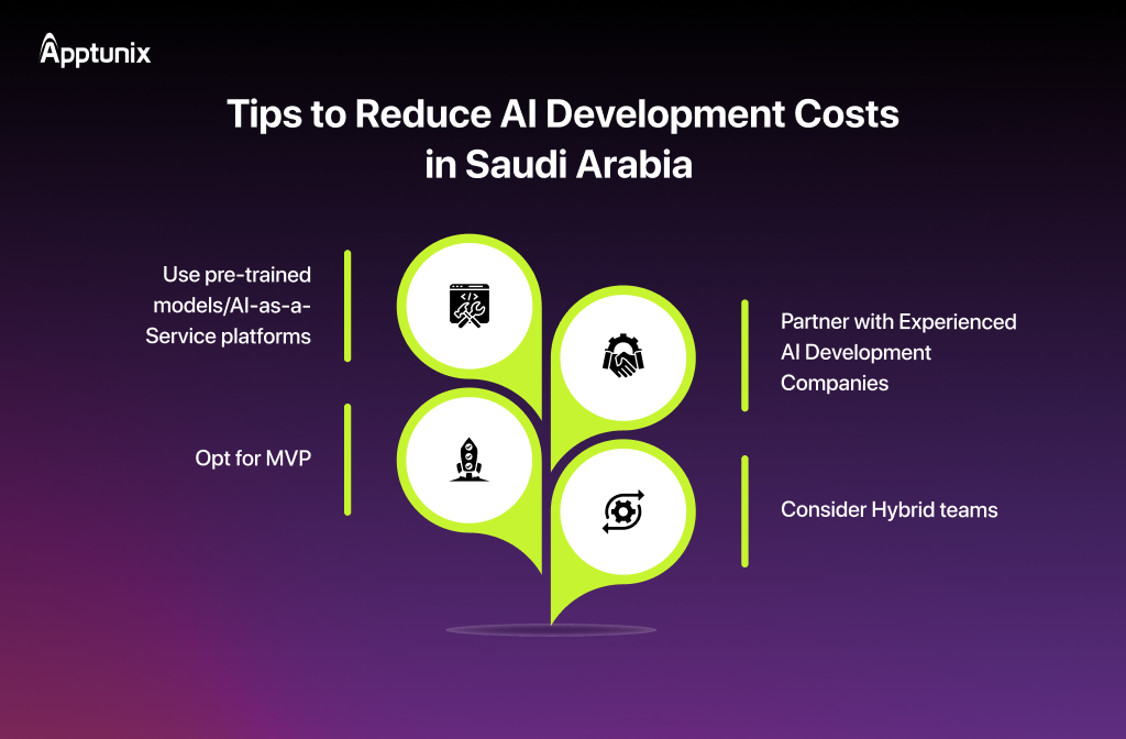 Businesses can reduce costs by starting with an MVP and using pre-built or AI-as-a-service tools.