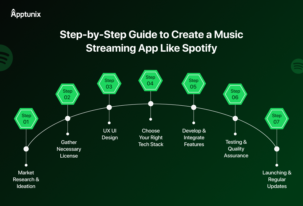 Let’s delve into a step-by-step guide to building an app like Spotify. We’ve broken it into clear and actionable stages from idea to launch. Let’s get into it:
