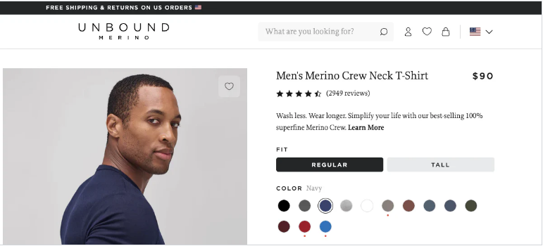 For instance, Unbound Merino’s product page highlights its signature t-shirt with the value proposition “Wash less. Wear longer. Simplify your life.”