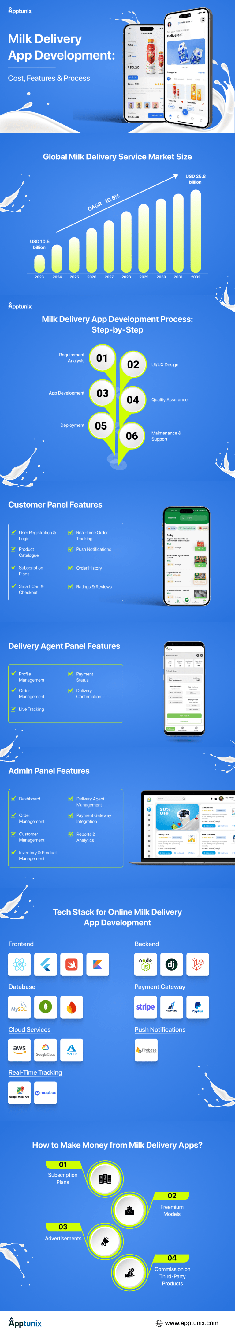 In day-to-day life, convenience is no longer a luxury—it’s an expectation. That’s why industries rooted in tradition, like dairy, are now embracing digital transformation. The global online milk delivery market is booming, valued at approximately USD 10.5 billion in 2023 and projected to reach USD 25.8 billion by 2032. Milk delivery app development is revolutionizing how dairy businesses operate. Instead of relying on manual tracking and early morning routes, these apps automate everything—from managing subscriptions to processing payments and tracking deliveries in real time.
